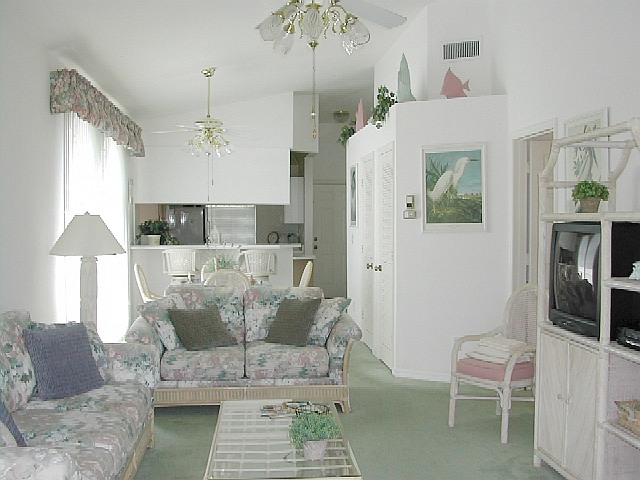 The Lely condo has cathedral ceilings for a spacious feeling and a large screened lanai overlooking the golf course. It has a fully equipped kitchen and a full size washer and dryer. There are two bedrooms and two full baths.